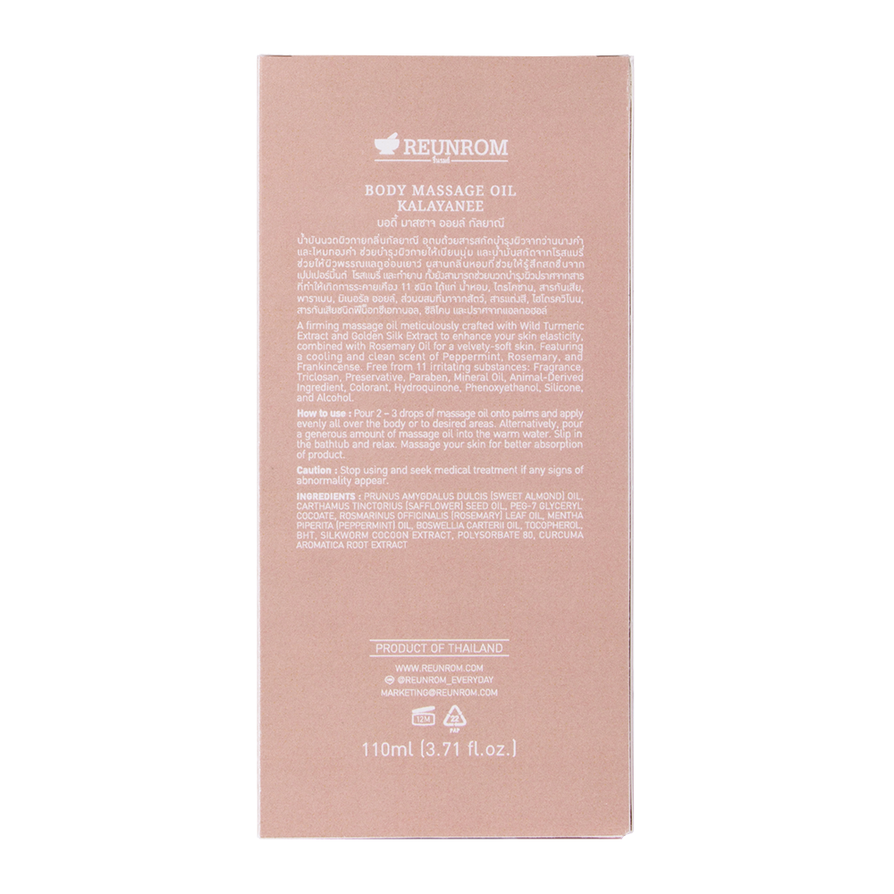 A firming massage oil meticulously crafted with Wild Turmeric Extract and Golden Silk Extract to enhance your skin elasticity and delay the occurrence of wrinkles, combined with Rosemary Oil for a velvety-soft skin. Featuring a cooling and clean scent of Peppermint, Rosemary, and Frankincense. Use this product to give your skin a refreshing boost. Free from 11 irritating substances: Fragrance, Triclosan, Preservative, Paraben, Mineral Oil, Animal-Derived Ingredient, Colorant, Hydroquinone, Phenoxyethanol, Silicone, and Alcohol.
