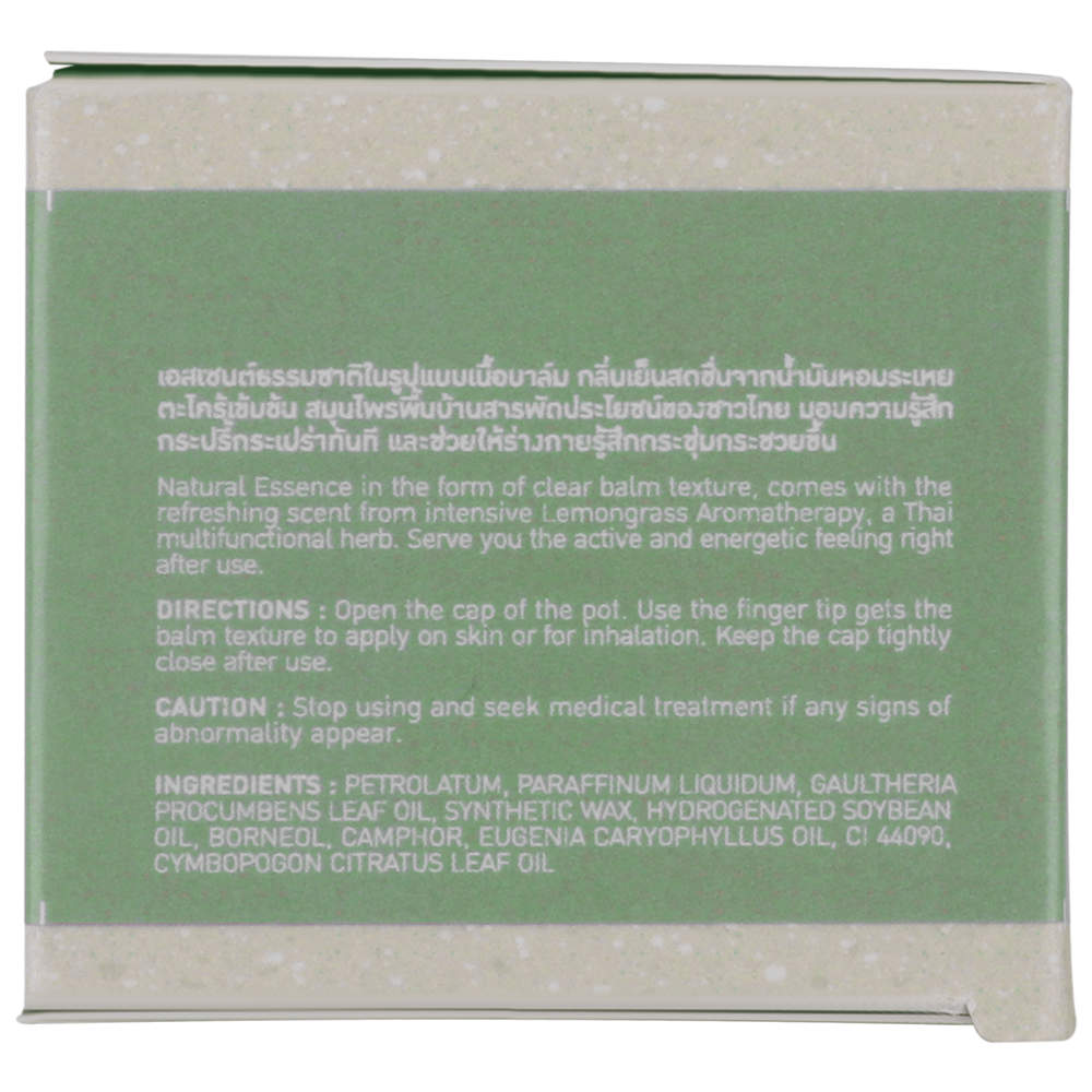 Natural Essence in the form of clear balm texture, comes with the refreshing scent from intensive Lemongrass Aromatherapy, a Thai multifunctional herb. Serve you the active and energetic feeling right after use.