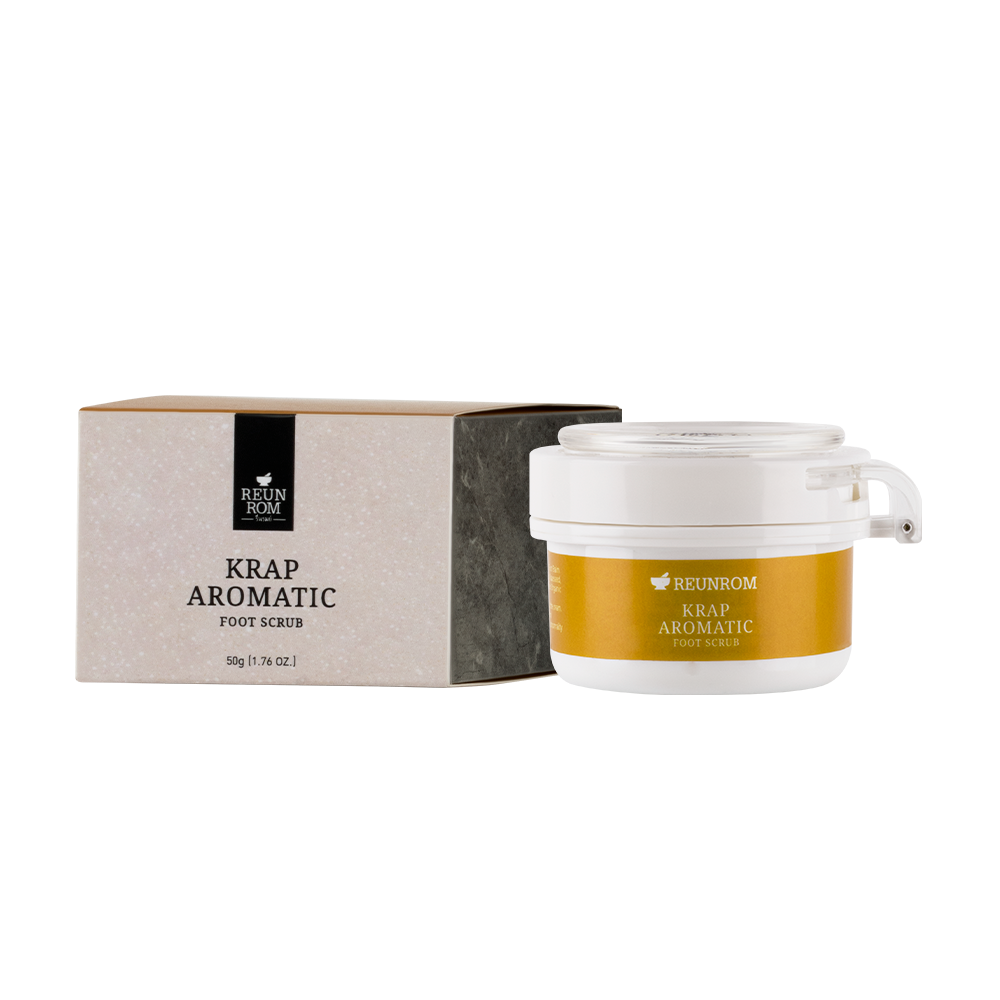 Introducing the Reunrom Krap Aromatic Foot Scrub, a foot scrub designed to gently eliminate dead skin cells and promote a soft, smooth texture. It reduces cracks and dryness, leaving your feet supple and delightful to the touch. Our specially processed scrub granules are soft, non-abrasive, and naturally dissolve. This extraordinary formula combines 13 natural oils, including Rapeseed, Jojoba, Macadamia, Shea Butter, Avocado, Cold-Pressed Organic Camellia Seed, Grape Seed, Sweet Almond, Hazelnut, Rice Bran Oil, Rosehip, Evening Primrose, and Meadowfoam Seed to provide unparalleled softness, hydration, and protection. Enhanced with antioxidant-rich and anti-wrinkle natural extracts from Cucumber, Centella Asiatica, Aloe Vera, and 3 varieties of Rice (Thai Jasmine Rice, Black Glutinous Rice, and Riceberry Rice). It also offers a delightful aroma of aromatherapy for intense nourishment. For optimal results, it is recommended to use in conjunction with foot cream and foot balm.